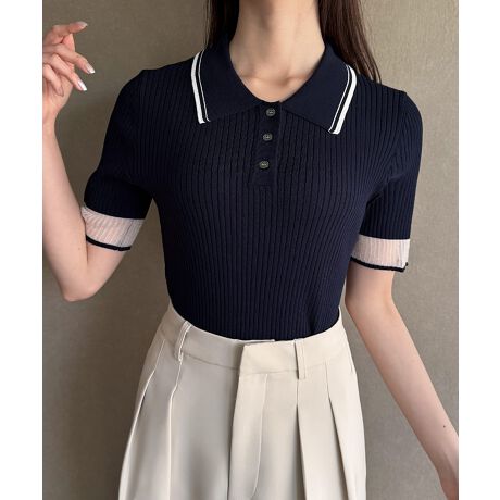袖口シアーバイカラーポロニット