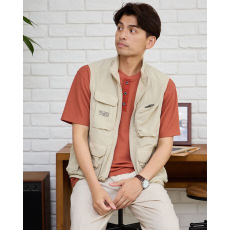 軽く羽織れるZIPベストです。表情のある薄手のナイロン素材を使用しています。部分的にメッシュで切り替え、涼しく快適な着心地が特徴です。前身頃の豊富なポケットも実用的で魅力です。ご家庭でのお洗濯(手洗い)が可能で、長い期間ご着用いただけます。