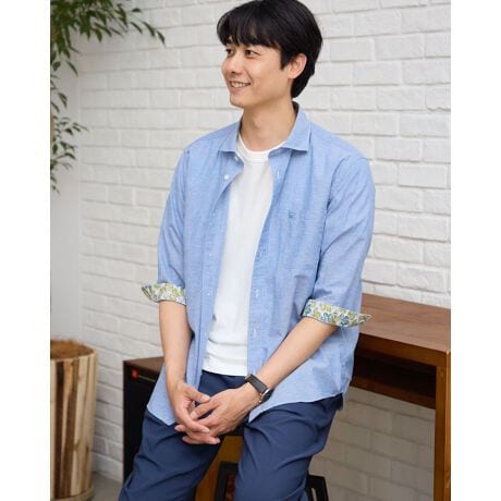 ワイドカラーの七分袖シャツです。接触冷感性に優れたシャンブレー生地を使用しています。イージーケア性に優れており、アイロンがけをしなくてもシワを気にすることなく着用いただけます。夏の軽い羽織りとしても活躍します。