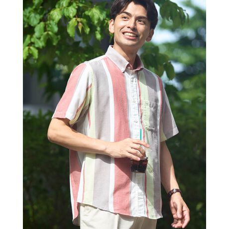 ボタンダウン襟のマルチストライプシャツです。織りの組織変化で凹凸を表現したサッカー素材を使用しています。肌離れがよくさらっとした着心地が特徴です。大柄のストライプですが、同系色にすることで着合わせしやすく仕上げました。