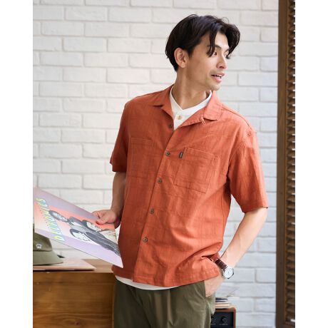 程よくゆとりのある綿ポリエステル素材の開襟シャツです。開放感のあるオープンカラーがリラックスしたムードを演出します。コットンのナチュラルな風合いと、ポリエステルの軽さ・速乾性を兼ね備えた素材で、シワになりにくく扱いやすいため、デイリーユースにも最適なアイテムです。胸のダブルポケットが実用的で、ややゆったりしたサイズ感に仕上げました。軽い羽織りとしてリラックスしたスタイリングを演出します。