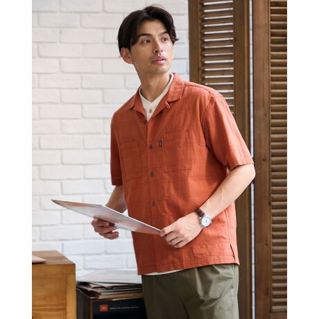 程よくゆとりのある綿ポリエステル素材の開襟シャツです。開放感のあるオープンカラーがリラックスしたムードを演出します。コットンのナチュラルな風合いと、ポリエステルの軽さ・速乾性を兼ね備えた素材で、シワになりにくく扱いやすいため、デイリーユースにも最適なアイテムです。胸のダブルポケットが実用的で、ややゆったりしたサイズ感に仕上げました。軽い羽織りとしてリラックスしたスタイリングを演出します。