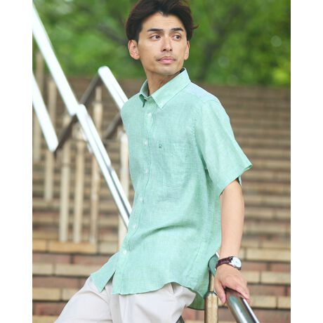 シワになりにくいフレンチリネン100%を使用したボタンダウン襟の半袖シャツです。柔らかな肌触りと吸放湿性に優れているのが特徴です。イージーケア性に優れており、アイロンがけをしなくてもシワを気にすることなく着用いただけます。
