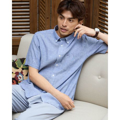 シワになりにくいフレンチリネン100%を使用したボタンダウン襟の半袖シャツです。柔らかな肌触りと吸放湿性に優れているのが特徴です。イージーケア性に優れており、アイロンがけをしなくてもシワを気にすることなく着用いただけます。