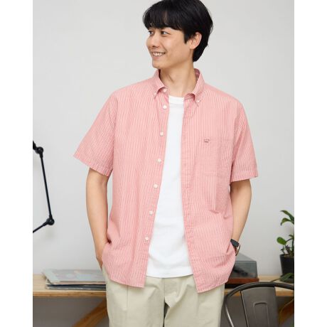 ボタンダウン襟のストライプシャツです。清涼感のある薄手のサッカー生地を使用しています。肌離れがよくさらっとした着心地が特徴です。同色系のストライプはギフトにもオススメしやすいアイテムです。