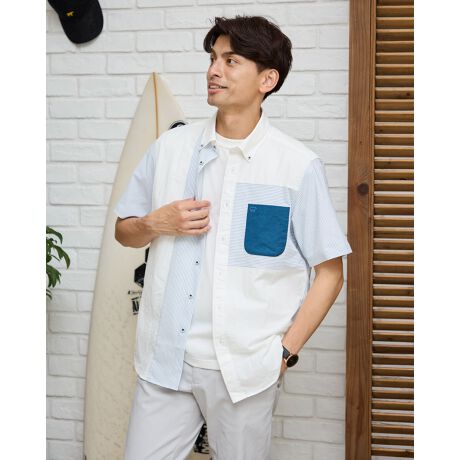 [型番:314R5312]異なる生地を切替えたボタンダウン襟の半袖シャツです。無地とストライプサッカー生地を切替え、表情のある雰囲気に仕上げました。年齢問わずすっきりしたカジュアルスタイルを演出します。