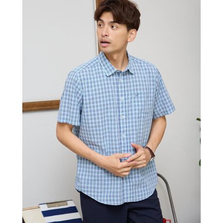レギュラー襟のチェックシャツです。清涼感のある薄手のサッカー生地を使用しています。肌離れがよくさらっとした着心地が特徴です。同系色のチェックは、ギフトにもオススメしやすいアイテムです。