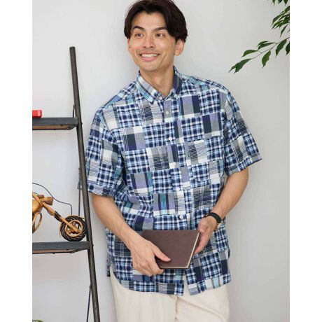 クラシックなアメリカンスタイルを象徴するマドラスチェックをパッチワークしたインド綿のボタンダウンシャツです。異なるチェック柄を組み合わせ、遊び心のあるデザインに仕上げました。ややゆったりしたシルエットで、品のある印象を演出します。カジュアルスタイルはもちろん、アメトラスタイルにもピッタリなアイテムです。