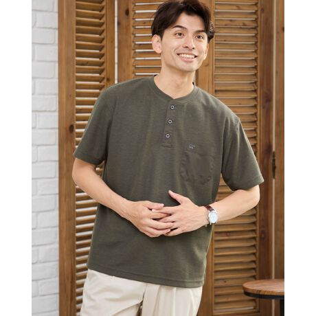 表情のあるワッフル鹿の子生地を使用したヘンリーネックTシャツです。前立てとポケット部分を身生地と同色の布帛で切り替えました。ライトアウターなどの羽織りアイテムのインナー使いとして重宝するTシャツです。
