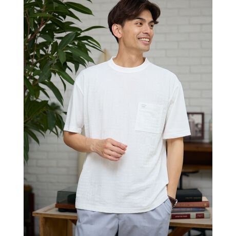 上品な無地柄のクルーネックTシャツです。総柄ジャカードでパッチワーク調のチェック柄を表現しました。無地柄なのでインナーとして着合わせしやすいアイテムです。
