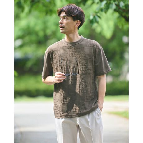 上品な無地柄のクルーネックTシャツです。総柄ジャカードでパッチワーク調のチェック柄を表現しました。無地柄なのでインナーとして着合わせしやすいアイテムです。