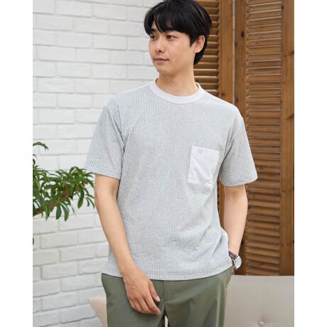 異なる生地で切り替えたクルーネックTシャツです。前身頃をサッカー生地、後身頃を天竺で切り替えました。大胆な切り替えがコーディネイトの主役になるTシャツです。
