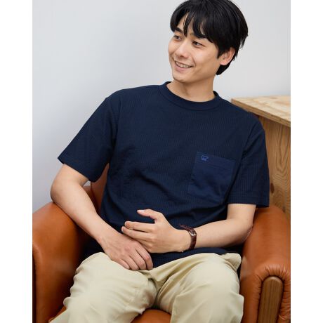 異なる生地で切り替えたクルーネックTシャツです。前身頃をサッカー生地、後身頃を天竺で切り替えました。大胆な切り替えがコーディネイトの主役になるTシャツです。
