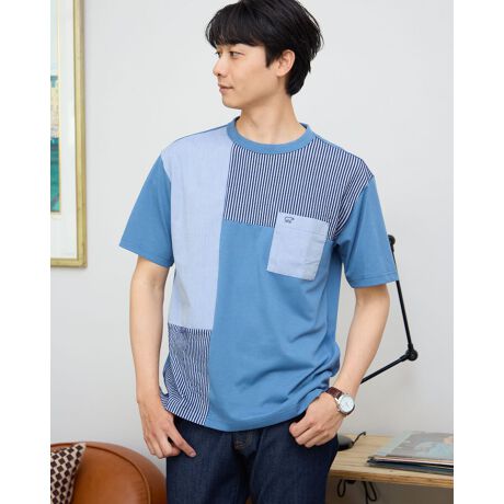 異なる生地で切り替えたクルーネックTシャツです。サッカー生地と色の異なる天竺で切り替えました。大胆な切り替えがコーディネイトの主役になるTシャツです。