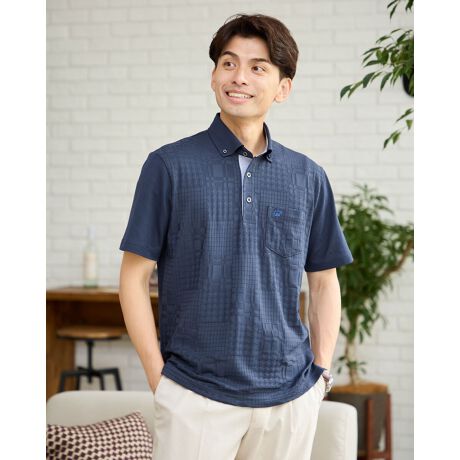 無地柄のボタンダウン襟ポロシャツです。総柄ジャカードでパッチワーク調のチェック柄を表現しました。セミワイドのボタンダウン襟でジャケットのインナーとしてもオススメです。