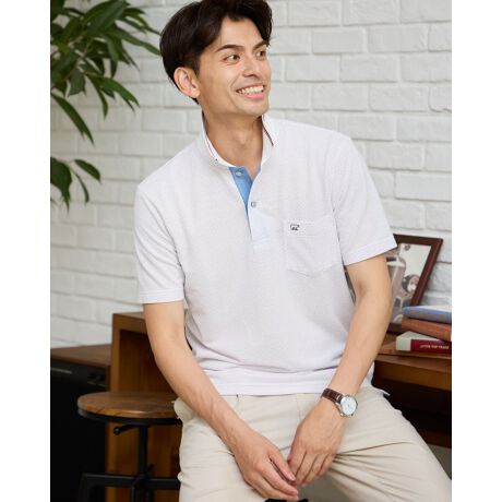 ドットをジャカードで表現したポロシャツです。吸水速乾性に優れた鹿の子素材を使用しています。さらっとした肌触りで着心地のよさが特徴です。総柄のドットを小さく表現し、無地感覚で着用いただけます。
