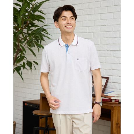 ドットをジャカードで表現したポロシャツです。吸水速乾性に優れた鹿の子素材を使用しています。さらっとした肌触りで着心地のよさが特徴です。総柄のドットを小さく表現し、無地感覚で着用いただけます。