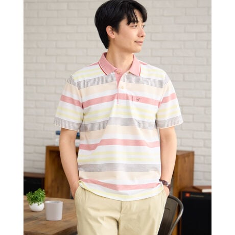リブ襟のボーダーポロシャツです。吸水速乾性に優れた鹿の子生地を使用しています。さらっとした肌触りで着心地のよさが特徴です。バーズアイ鹿の子でボーダーを表現し、優しい配色に仕上げました。父の日のギフトとしてもオススメしやすいアイテムです。