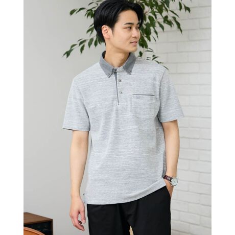 布帛襟のボタンダウン襟ポロシャツです。表情のあるハニカム鹿の子生地を使用しています。吸水速乾性に優れており、さらっとした着心地のよさが特徴です。父の日のギフトとしてもオススメしやすいアイテムです。