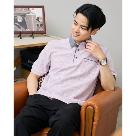 布帛襟のボタンダウン襟ポロシャツです。表情のあるハニカム鹿の子生地を使用しています。吸水速乾性に優れており、さらっとした着心地のよさが特徴です。父の日のギフトとしてもオススメしやすいアイテムです。