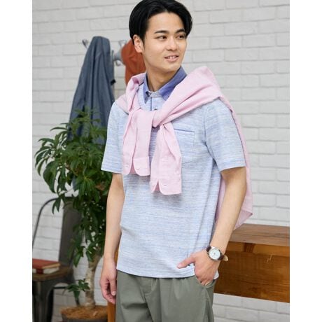 布帛襟のボタンダウン襟ポロシャツです。表情のあるハニカム鹿の子生地を使用しています。吸水速乾性に優れており、さらっとした着心地のよさが特徴です。父の日のギフトとしてもオススメしやすいアイテムです。
