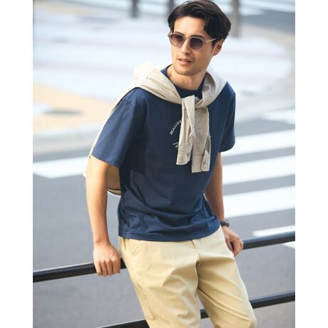 アイコンのクマとサーフをモチーフにしたプリントTシャツです。吸水速乾性・接触冷感性に優れたプレーティング天竺生地を使用しています。さらっとした肌触りで快適に着用いただけます。襟ぐりは身頃同色染で強度のあるフライスを使用、バインダー始末にすることでヨレにくさを実現しました。
