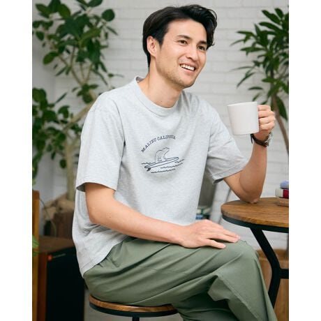 アイコンのクマとサーフをモチーフにしたプリントTシャツです。吸水速乾性・接触冷感性に優れたプレーティング天竺生地を使用しています。さらっとした肌触りで快適に着用いただけます。襟ぐりは身頃同色染で強度のあるフライスを使用、バインダー始末にすることでヨレにくさを実現しました。