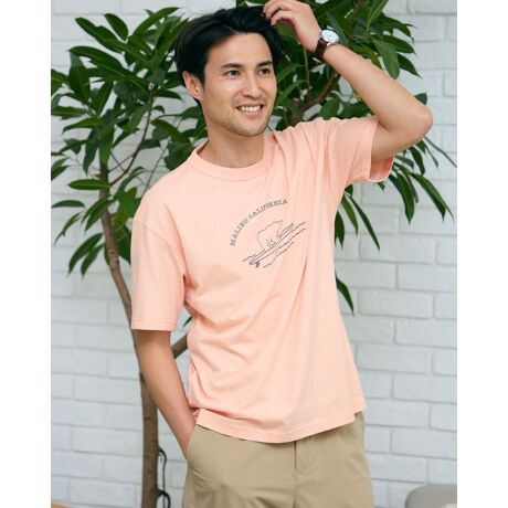 アイコンのクマとサーフをモチーフにしたプリントTシャツです。吸水速乾性・接触冷感性に優れたプレーティング天竺生地を使用しています。さらっとした肌触りで快適に着用いただけます。襟ぐりは身頃同色染で強度のあるフライスを使用、バインダー始末にすることでヨレにくさを実現しました。
