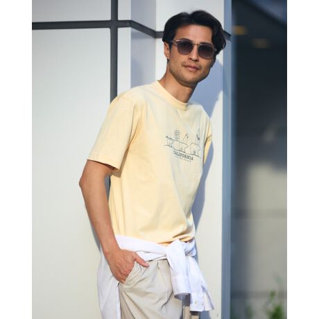 アイコンのクマとサーフをモチーフにしたプリントTシャツです。吸水速乾性・接触冷感性に優れたプレーティング天竺生地を使用しています。さらっとした肌触りで快適に着用いただけます。襟ぐりは身頃同色染で強度のあるフライスを使用、バインダー始末にすることでヨレにくさを実現しました。