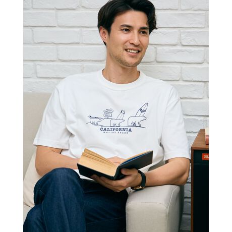 アイコンのクマとサーフをモチーフにしたプリントTシャツです。吸水速乾性・接触冷感性に優れたプレーティング天竺生地を使用しています。さらっとした肌触りで快適に着用いただけます。襟ぐりは身頃同色染で強度のあるフライスを使用、バインダー始末にすることでヨレにくさを実現しました。