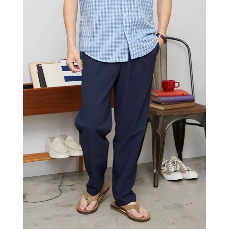 ワンタックのイージースラックスです。ポリエステルサッカー素材を使用しています。凹凸感があり肌離れがよく、さらっとしたはき心地が特徴です。レギュラーシルエットで着合わせのしやすさも魅力です。