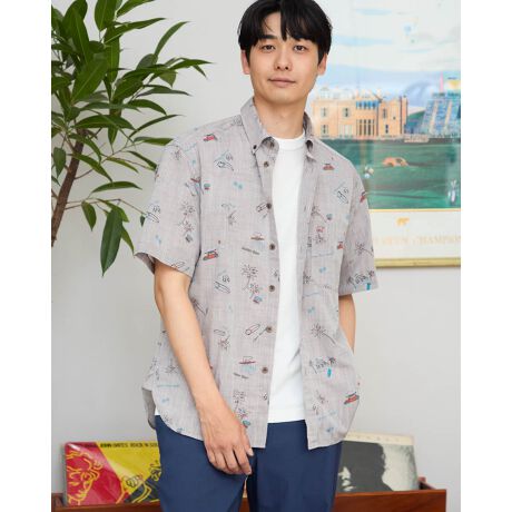 ボタンダウン襟のプリントシャツです。涼感のあるシャンブレー生地にサーフィンをモチーフにした楽しさを感じるプリントを施しました。大きめの胸のダブルポケットと幅広いヨーク切替、太めのステッチなどゆるい雰囲気に仕上げました。サイズ感もややゆったりとしたリラックスシルエットです。