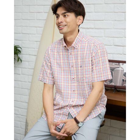 ボタンダウン襟のチェックシャツです。清涼感のある薄手のサッカー生地を使用しています。肌離れがよくさらっとした着心地が特徴です。着合わせしやすい白場のチェックは、ギフトにもオススメしやすいアイテムです。