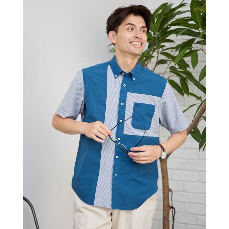 異なる生地を切替えたボタンダウン襟の半袖シャツです。無地とストライプサッカー生地を切替え、表情のある雰囲気に仕上げました。年齢問わずすっきりしたカジュアルスタイルを演出します。