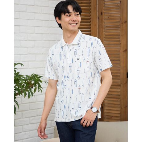 サーフをモチーフにしたプリントが印象的なポロシャツです。接触冷感性に優れたダブル組織の鹿の子素材を使用しています。総柄プリントがコーディネートの主役になるアイテムです。