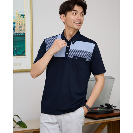 前身頃を異なる生地で切り替えたポロシャツです。さらっとした肌触りで着心地のよさが特徴です。大胆な切り替えがコーディネートの主役になるアイテムです。