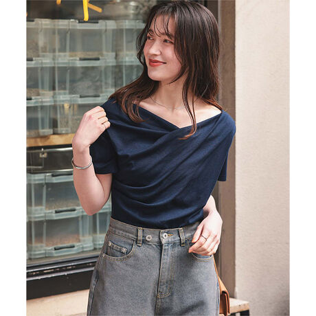 ・ドレープディテールでトレンド感抜群のオフショルダーTシャツ・程よく厚みがあり柔らかい素材感・身体にフィットするコンパクトなシルエット・ヘルシーな肌見せを叶えてくれます・豊富なカラーバリエーションが嬉しいポイント[型番:AFXN2175]