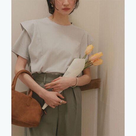 【汗染み防止加工シリーズ】・肩から裾にかけてラッフルデザインが程よく女性らしく、スタイリッシュな雰囲気に。シンプル過ぎない、一枚で様になるTシャツに。・気になる二の腕カバーもばっちりな袖丈◎・カジュアルな中に、上品さのある詰まったクルーネック。[型番:AFXT0330]