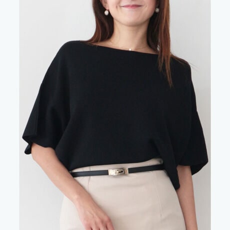 露出を抑え、すっきりとしたボートネックと袖丈を活かしたドルマンスリーブ。