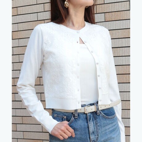 フロントに繊細なレースをあしらい、エレガントシックなムードが漂うカーディガン。
