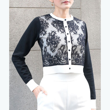 フロントに繊細なレースをあしらい、エレガントシックなムードが漂うカーディガン。
