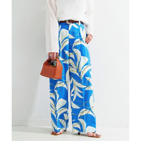 天然タッチな風合いの麻混素材を使用し、落ち感もあるナチュラルすぎない生地に柄を乗せています。タックトラウザー型ですっきりしたナローストレートシルエットなので、合わせるトップスの幅が広がります。インパクト強めですが、パンツとセットアップの夏ならではの着こなし方もおすすめです。