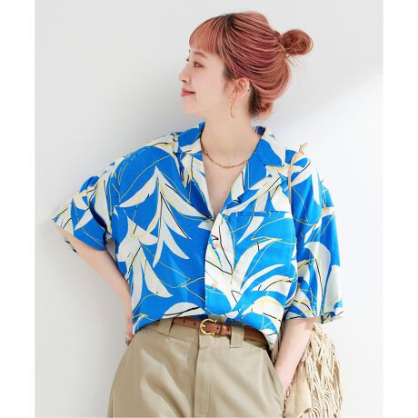 天然タッチな風合いの麻混素材を使用し、落ち感もあるナチュラルすぎない生地に柄を乗せています。オープンカラーのボックス型のややルーズなシルエットで、メンズライクな柄シャツになっています。インパクト強めですが、パンツとセットアップの夏ならではの着こなし方もおすすめです。