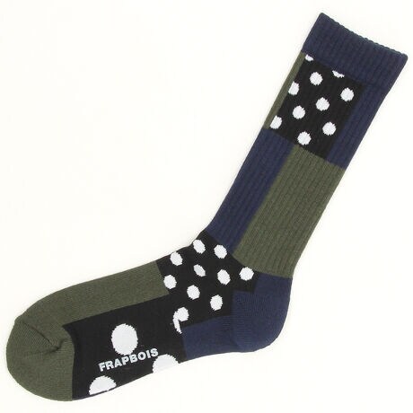 【素材】適度な膨らみと発色の良さが特徴の糸を使ったスポーツタイプのソックス。【デザイン】カラーブロックのデザイン。部分的にドット柄が入っているのがポイントになっています。底がパイル仕様になっており、クッション性があります。Fサイズ:24〜27cm【ブランド情報】FRAPBOIS/フラボア2001年にブランドスタート。「大人げない大人の服」をコンセプトに、大人が着るリラックスしたデイリーウェアを提案するコレクションブランド。レディースとメンズのアイテムをご用意しています。