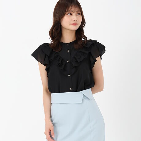 V字のフリルが華やかに装うブラウス。ふんわりとしたフリルのボリューム感でスタイリングも女性らしい印象に。気になる二の腕を華奢に見せてくれる嬉しい効果も期待できます。普段使いはもちろん、デートやオフィスコーデにと、幅広く活躍してくれるアイテムです。■fabric透け感[有り]裏地[無し]伸縮性[やや有り]生地の厚さ[薄手]