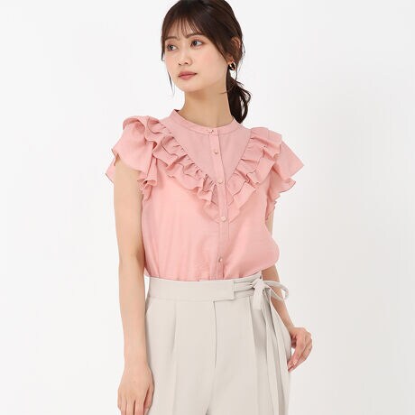 V字のフリルが華やかに装うブラウス。ふんわりとしたフリルのボリューム感でスタイリングも女性らしい印象に。気になる二の腕を華奢に見せてくれる嬉しい効果も期待できます。普段使いはもちろん、デートやオフィスコーデにと、幅広く活躍してくれるアイテムです。■fabric透け感[有り]裏地[無し]伸縮性[やや有り]生地の厚さ[薄手]