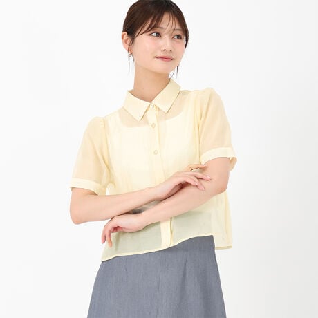 シアー素材の半袖シャツ。インナーと合わせて一枚でも着れるよう、程よいサイズ感のボックスシルエットに仕上げました。長めの半袖が二の腕までカバーし、女性らしく華奢見えします。短めの着丈で羽織としても着用いただける万能アイテムです。