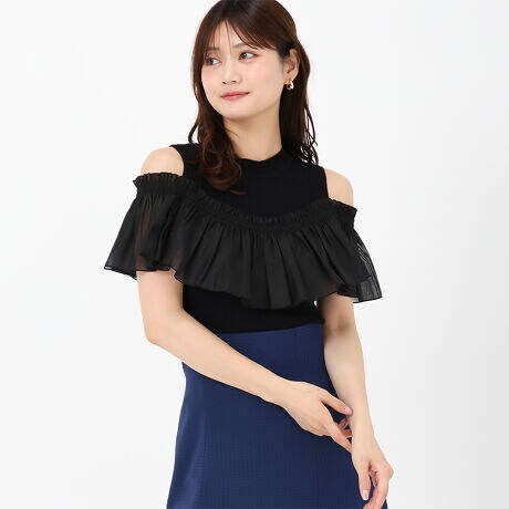 肩開きラッフルデザインがポイントの2wayニットです。アイレットリブ編みはシンプルながらもトレンド感があり、可愛らしさと華やかさを引き立てるデザインです。ラッフルのボリューム感で二の腕カバーもできる一枚です。