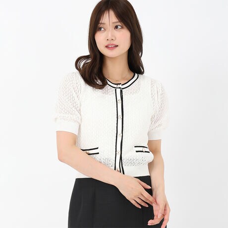 レースのような繊細な透かし柄で上品な華やかさを演出するカーディガン。ふっくらボリューム感のあるパフスリーブも愛らしい印象をプラスしてくれます。コーディネートに取り入れるだけでも、旬なスタイリングに決まる大人可愛いアイテムです。■fabric透け感[有り]裏地[無し]伸縮性[有り]生地の厚さ[普通]