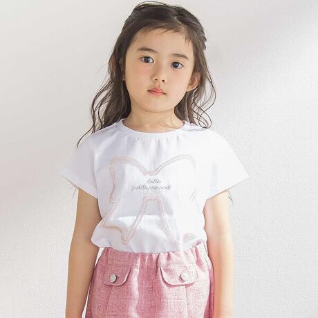 キュートなリボンモチーフが目を引く、女の子用半袖Tシャツです。